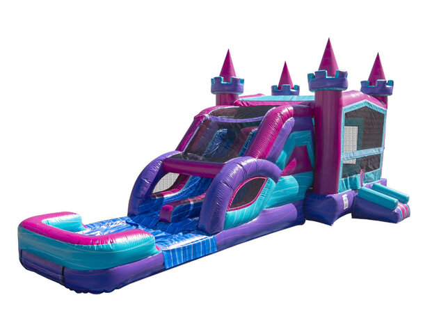 Pink Bounce House with Dual Lane Slide has a large bounce house with hoop (balls not inculded) and dual lane slide!